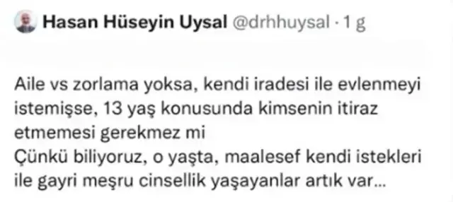 Bakanlık tarafından soruşturma başlatılması kamuoyunda geniş yankı uyandırırken, doktor H.H.U.’nun geçmişte yaptığı skandal bir paylaşım daha ortaya çıktı. Tabibin “Kendi iradesiyle evlenmek istemişse, 13 yaş konusunda kimsenin itiraz etmemesi gerekmez mi? Zira biliyoruz, o yaşta, maalesef kendi istekleri ile gayri legal cinsellik yaşayanlar artık var” sözlerini kullandığı görüldü.