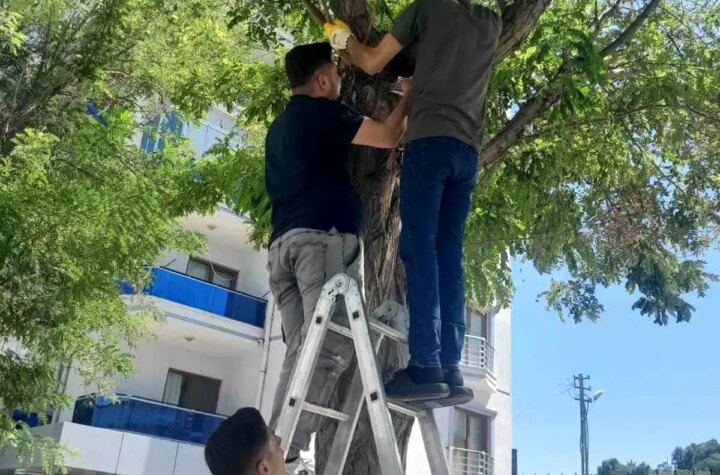 Konya'nın Karapınar ilçesinde, konutta beslenen bir kedi ağaca tırmandı. Esnaf Mehmet Emin Kolay ve...
