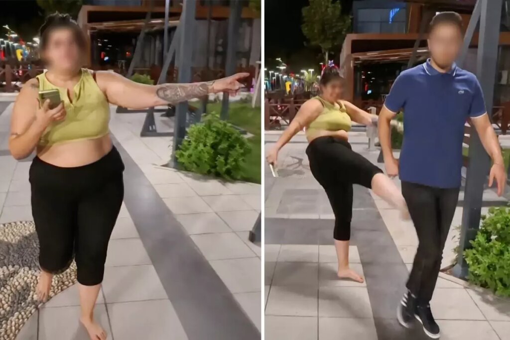 Yardım için bayanın yanına giden bir genç, neye uğradığını şaşırdı. Genci itip kakan ve tekme atarak darbeden bayan, yardımına gelen öbür bireylere de tehditler savurdu.